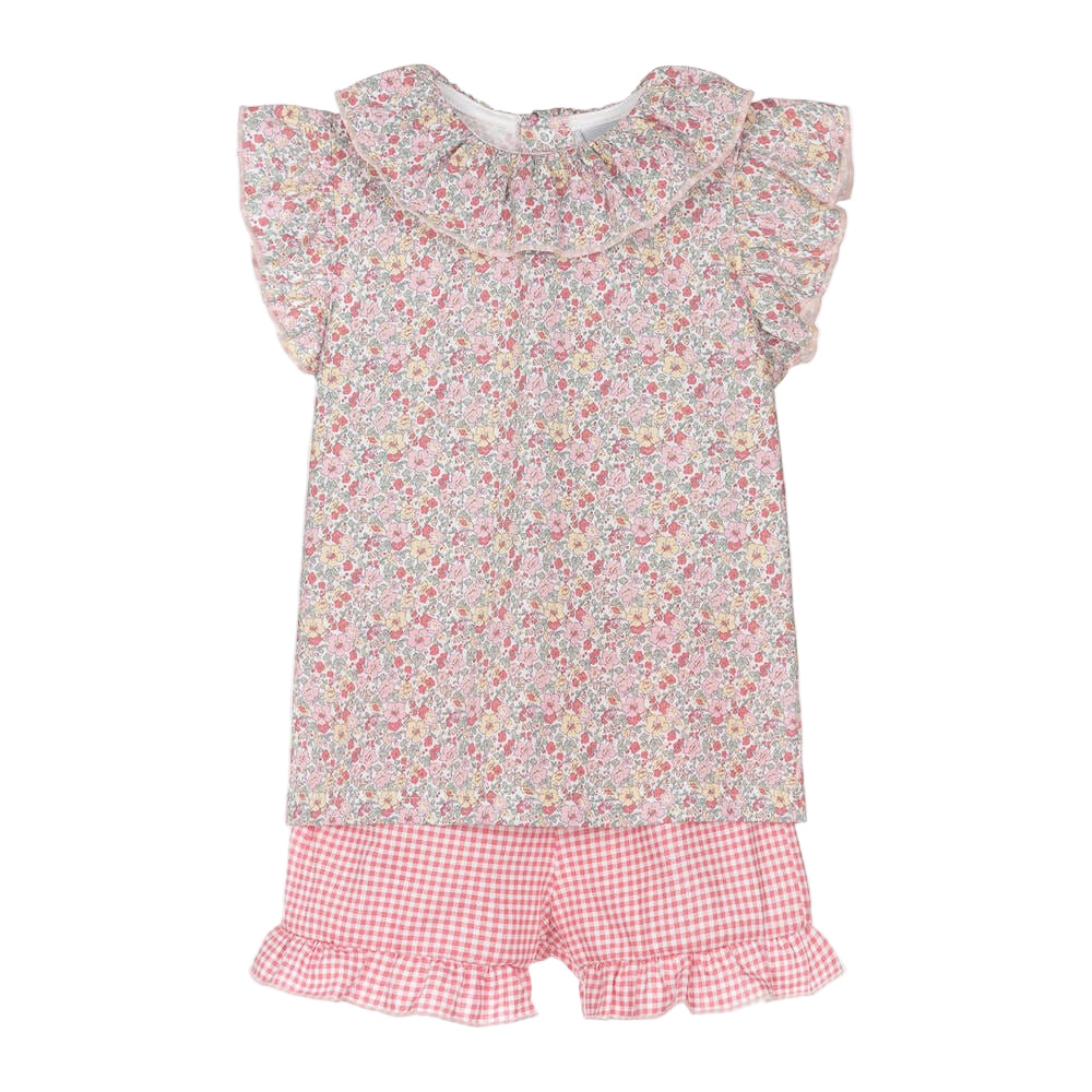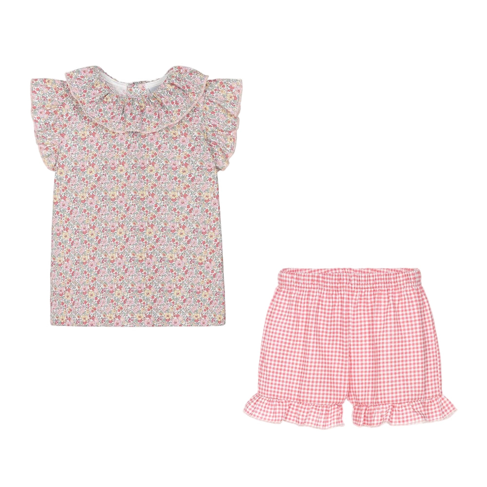 Floral Top and Gingham shorts set for girls by Babidu, made in comfortable cotton. The top has a floral print throughout with ruffle trims on the arm caps and a frill collar. The shorts have a gently elasticated waistband and are in a contrasting gingham print.