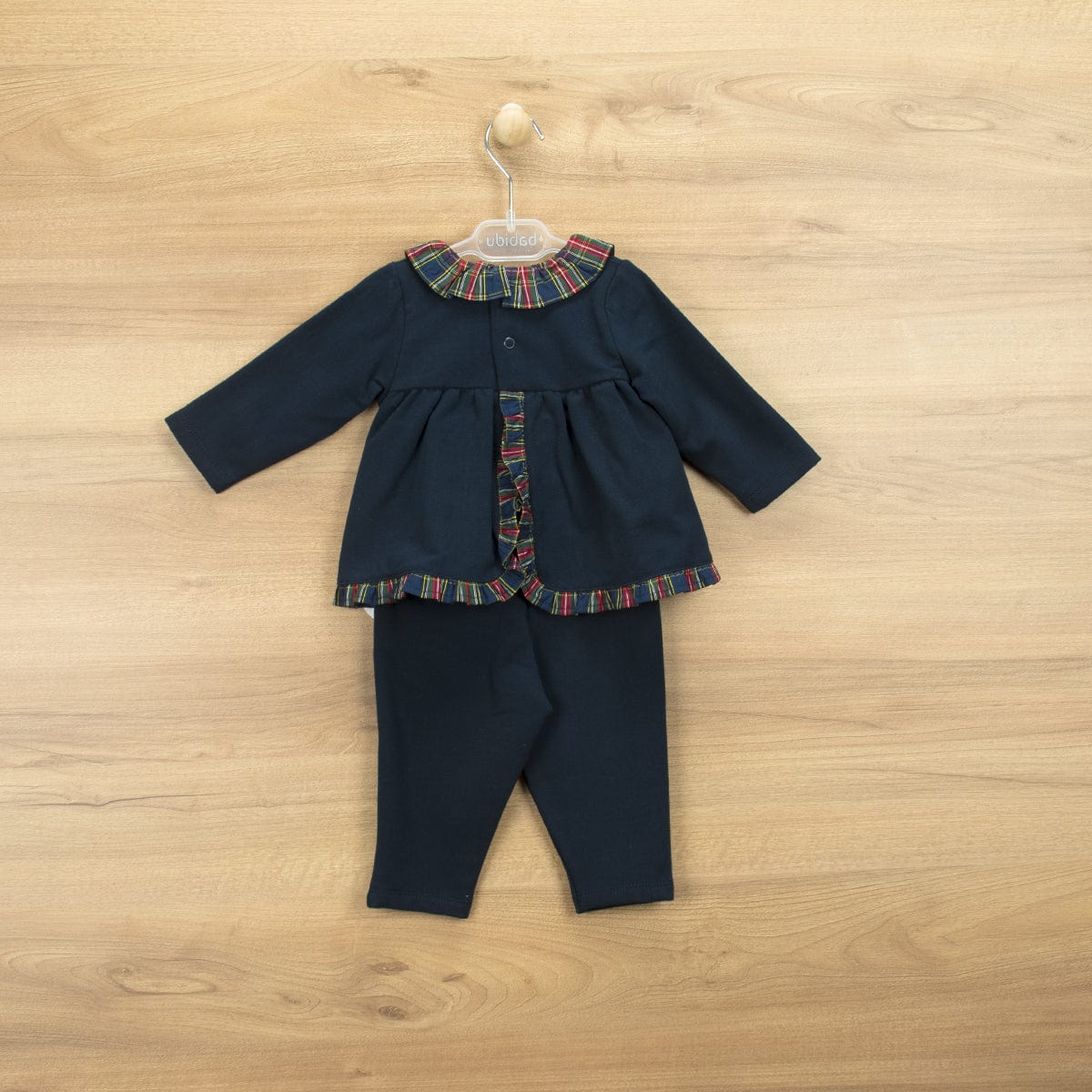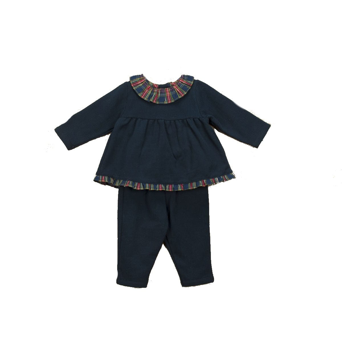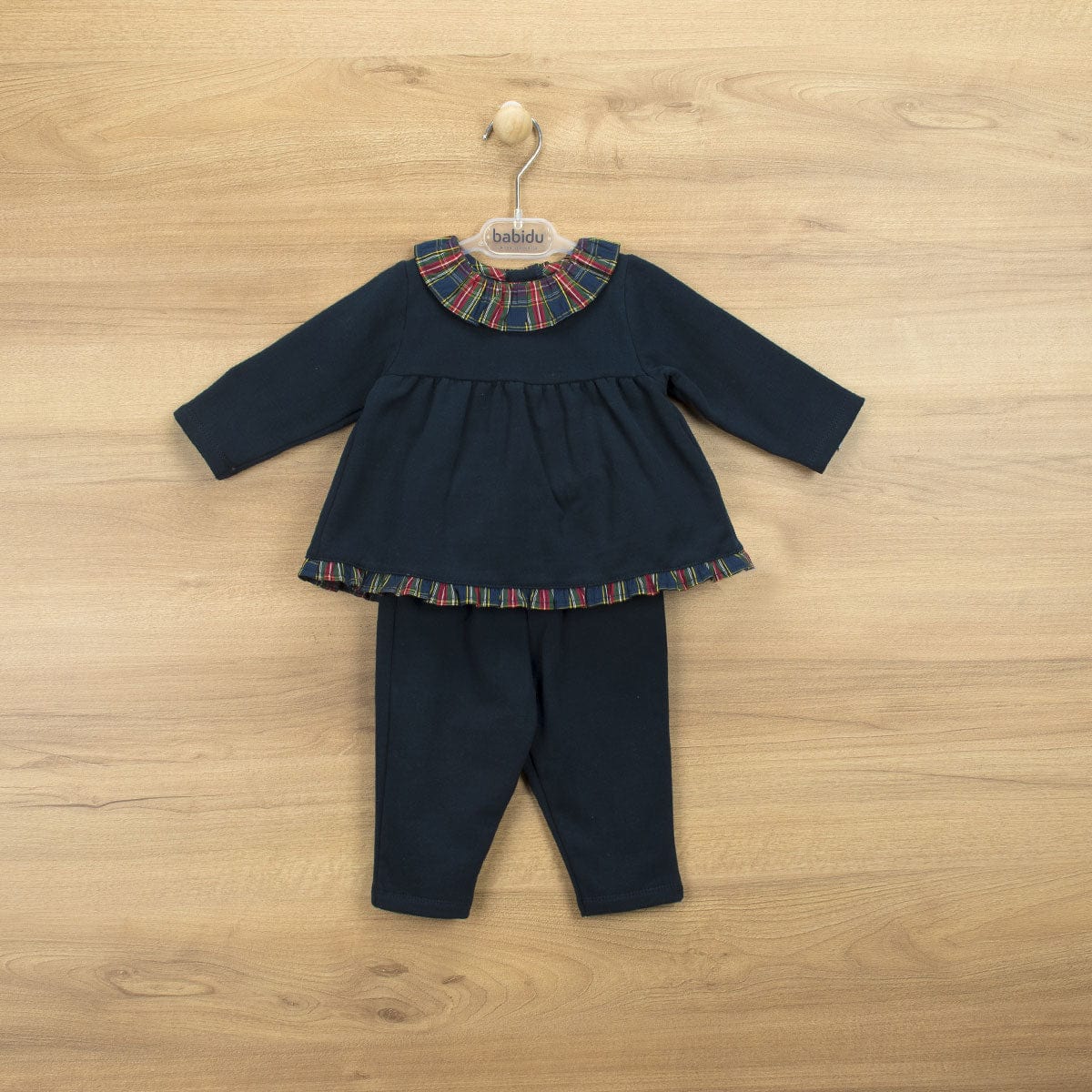 Navy blue trouser set for girls by Babidu, made in comfortable cotton jersey with a soft brushed feel inside. The top has red, green and blue tartan ruffle trims and popper fastenings on the crossover open back. The trousers have a gently elasticated waistband.