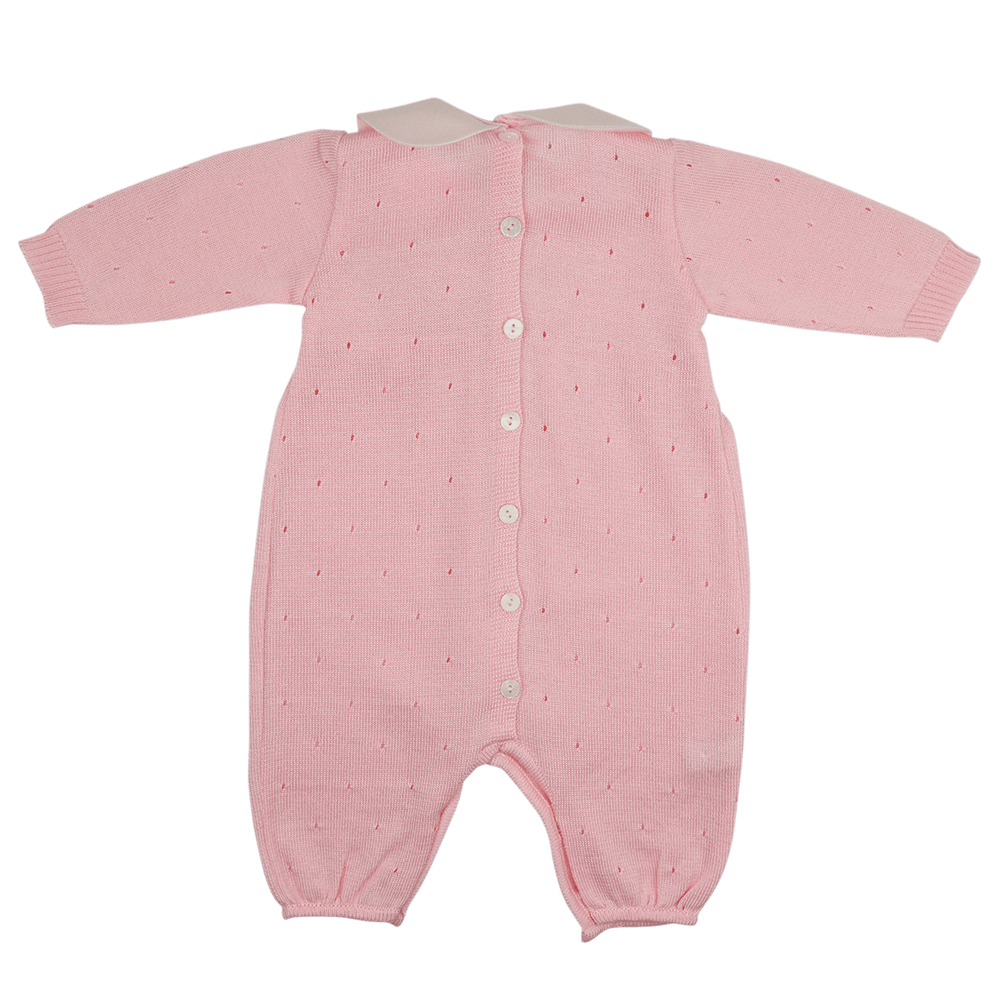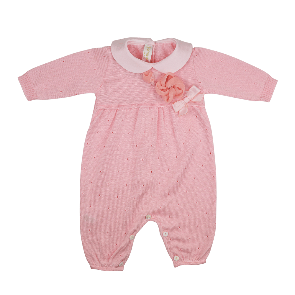 This Bimbalo pink knitted playsuit has a pink satin feel collar, complete with a beautiful pink flower design with diamanté diamond detailing in the centre. Together with a stunning pink bow on the front of the garment. Made from an extremely soft material designed to be soft on the skin. Buttons down the back and legs to fasten making changing an easy task.