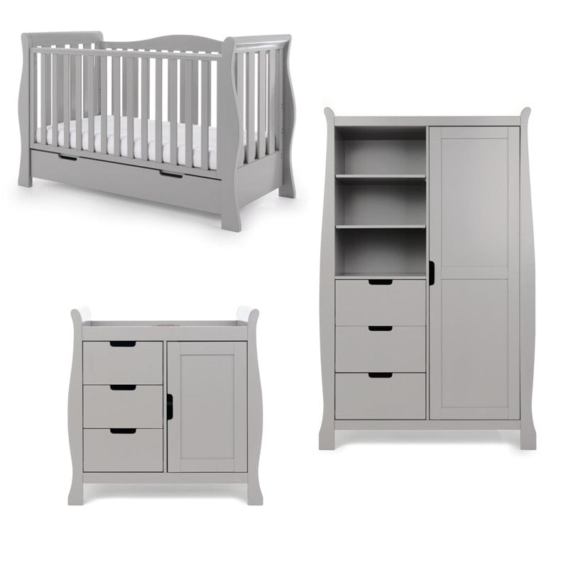 The Obaby Stamford furniture range offers families the perfect combination of style, quality and practicality. The Stamford Luxe 3 piece room set consists of the beautiful Stamford Luxe cot bed with under drawer, closed changing unit and double wardrobe. All pieces feature the same elegant sleigh design that flows throughout the Stamford range.