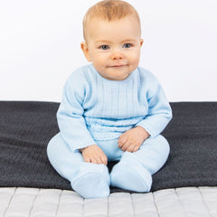This Boys Blue Knitted Two Piece is made in Portugal for the baby clothing brand, Dandelion.