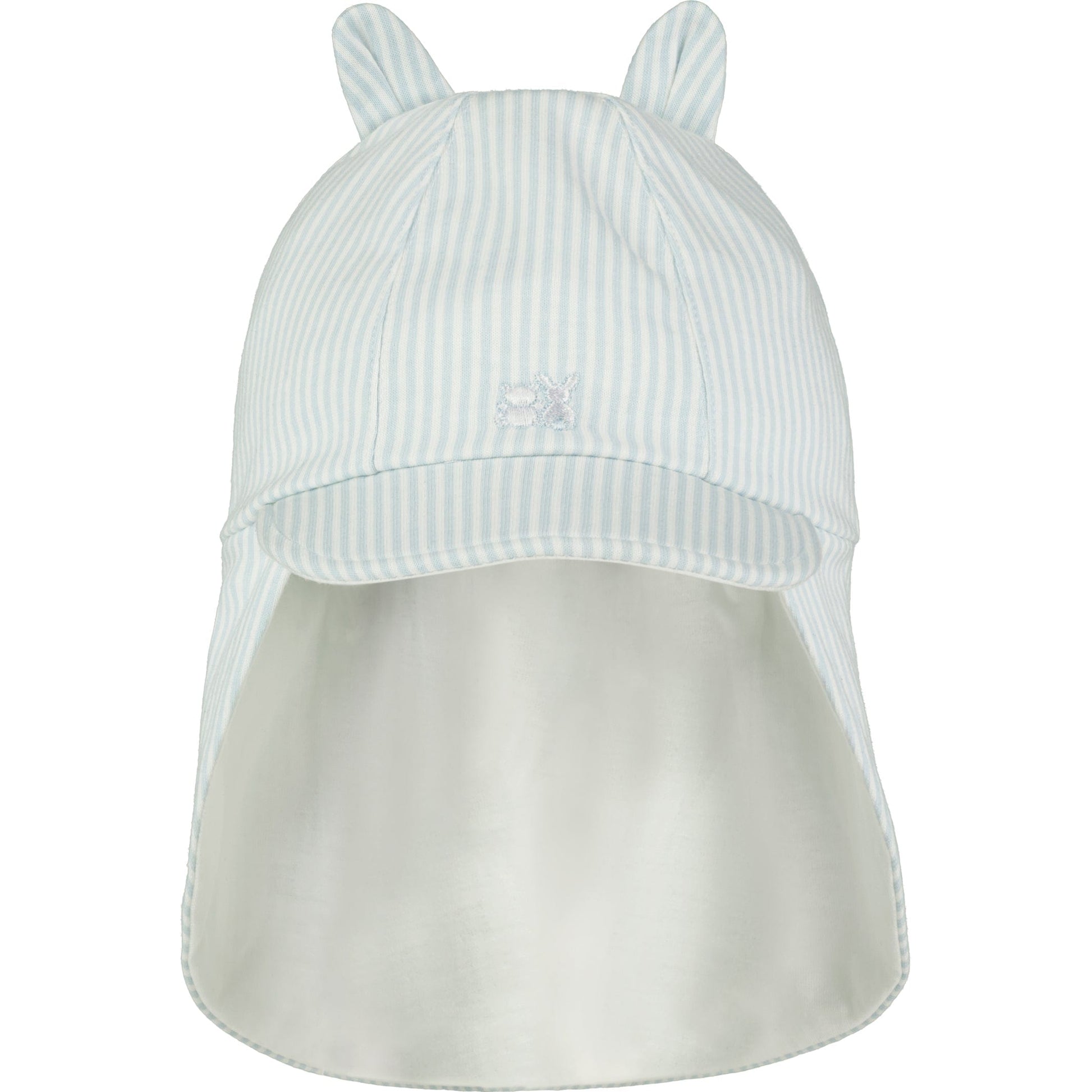 Keep baby’s neck protected from the sun with this perfect little cap. All in pale blue & white striped cotton, lined in white, and with a sun flap, the cap will coordinate beautifully with our signature blue garments. It also features two cute little ears, perfect for your little cutie!