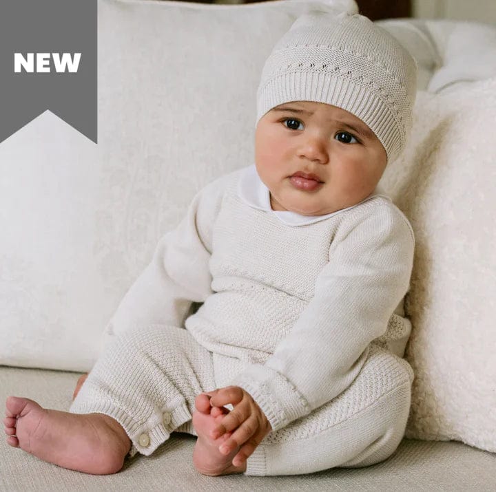 Introducing Harley, different textured knit is the key feature to this lovely all in one. New for this season in stone, this garment is unisex and is perfect for the transition from autumn to winter. Beautifully knitted with a white rounded collar, pearlised buttons and a cosy matching pull on hat this garment is just the thing for a leafy autumn walk!
