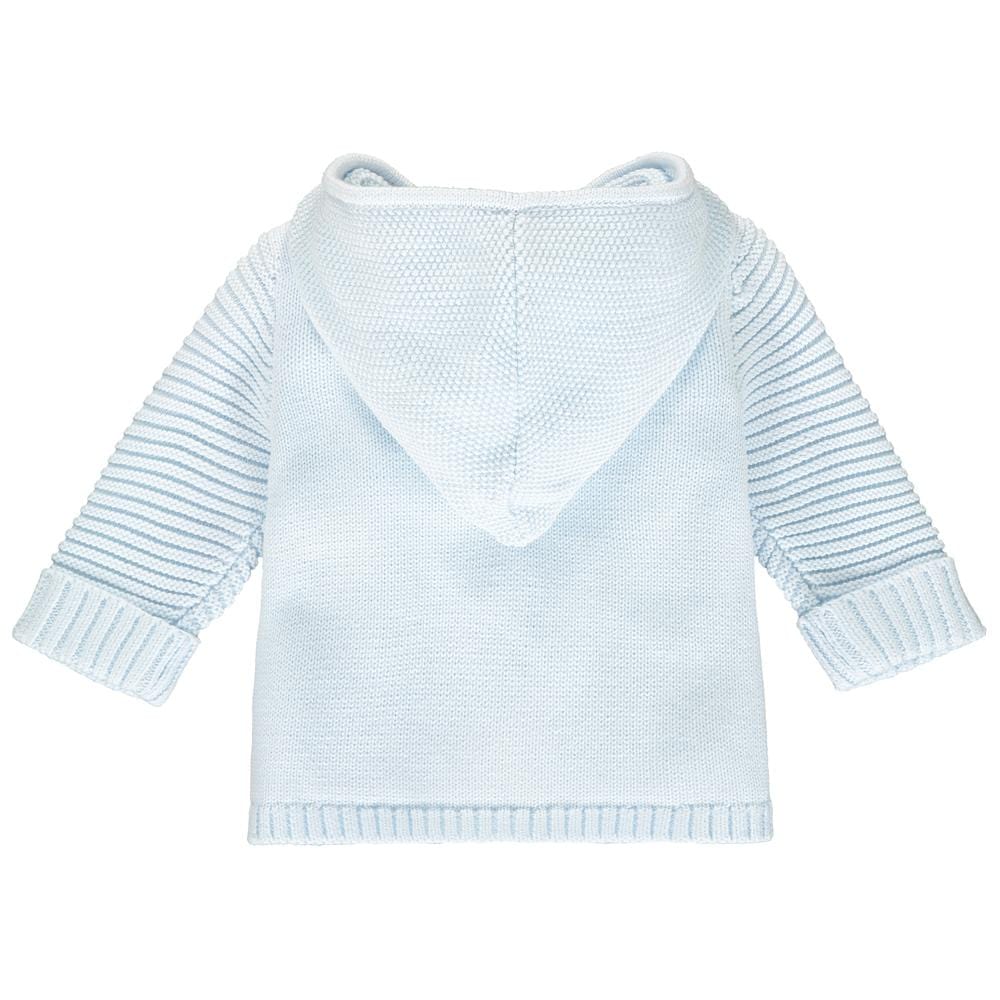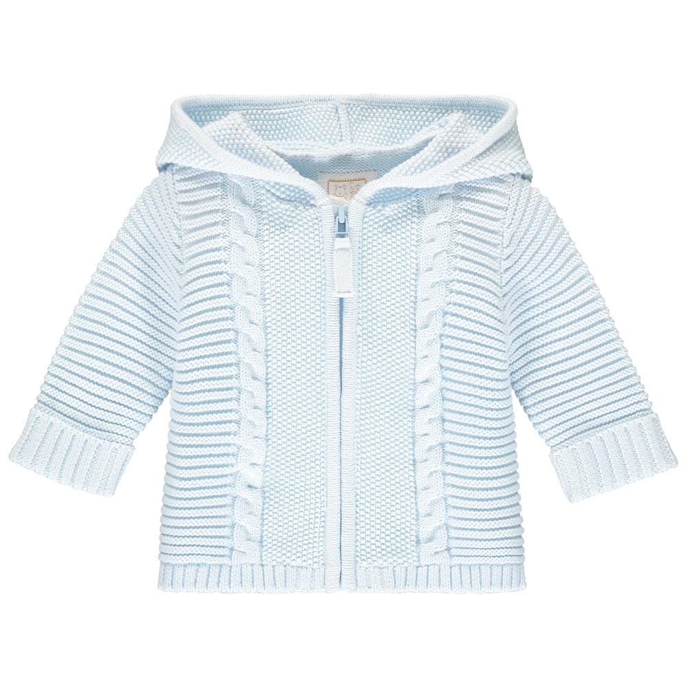 This Emile et Rose 'Norris' jacket is the perfect autumn pale blue hooded knitted jacket which adds extra warmth to any Emile et Rose outfit. The jacket has a variation of different knit styles, the main feature being two vertical columns of cable knit from each shoulder. Finished with a full length zip that allows for easy dressing.