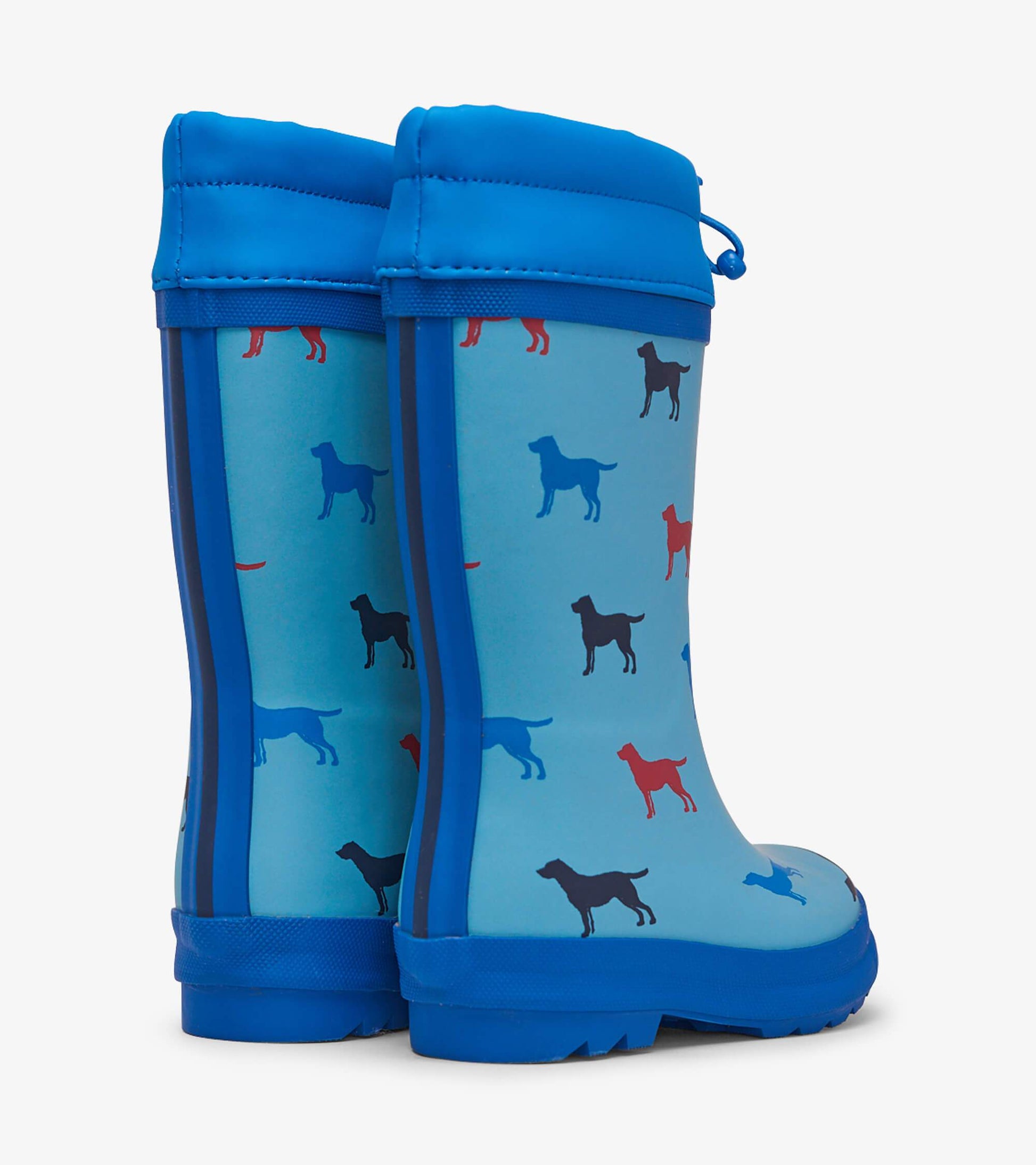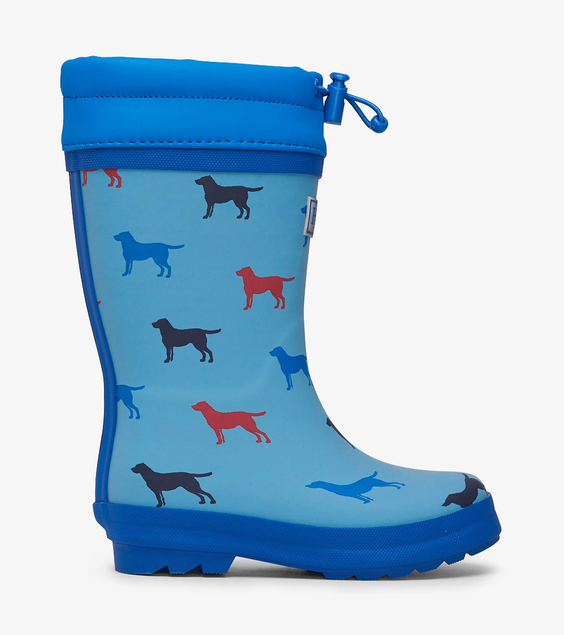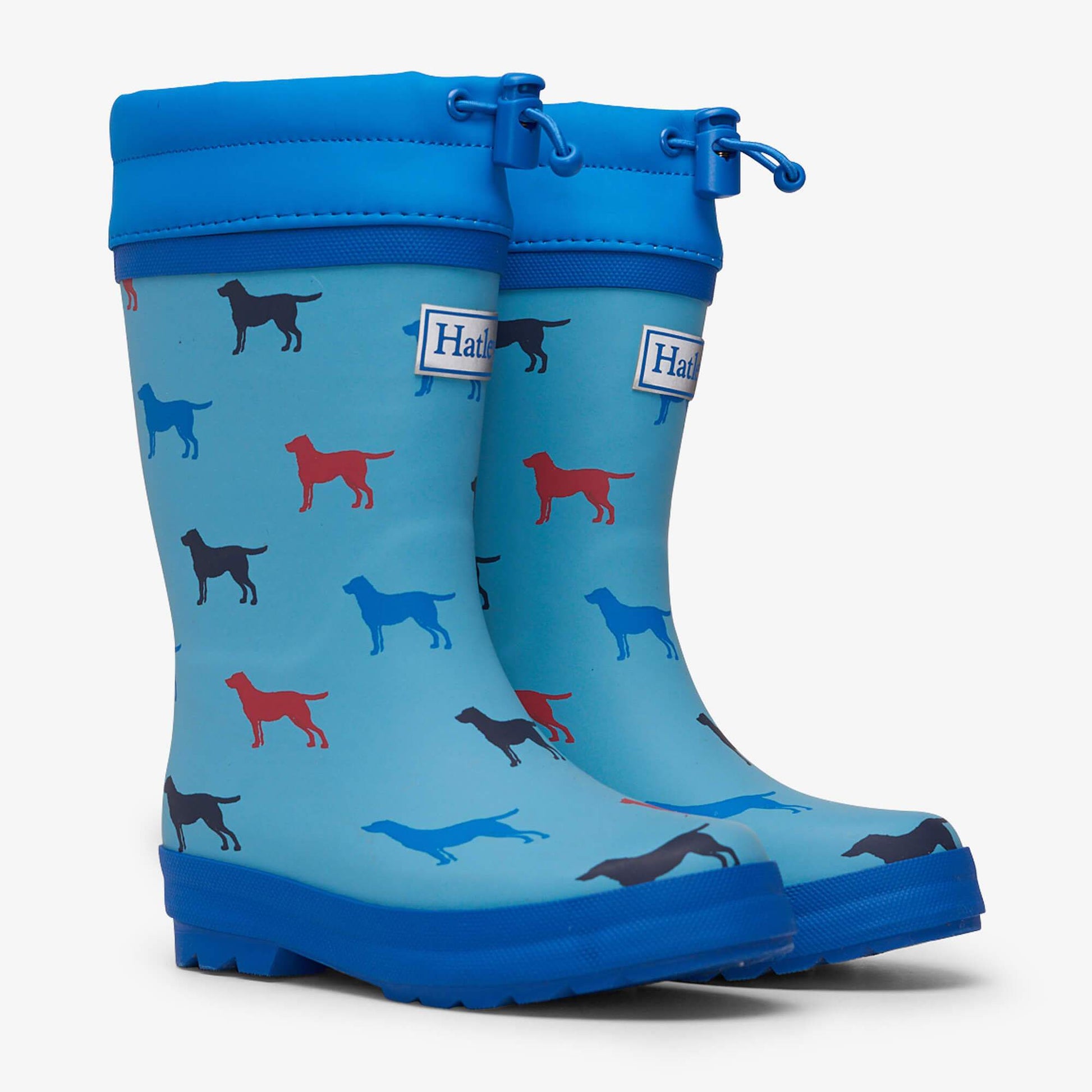 These Hatley 'friendly labs' design blue rain boots have a cool two tone blue and red labradors print throughout the boots with a blue trim on the sole and at the top of the shoe, complete with a fastening toggle at the front to prevent water getting in.