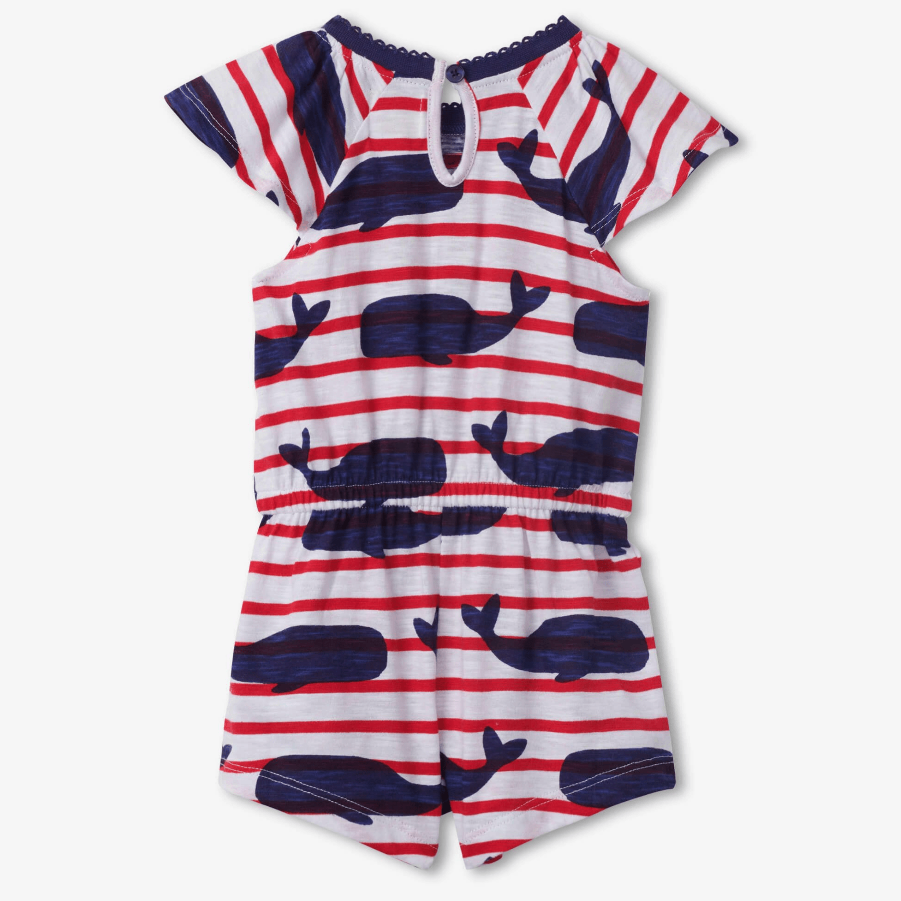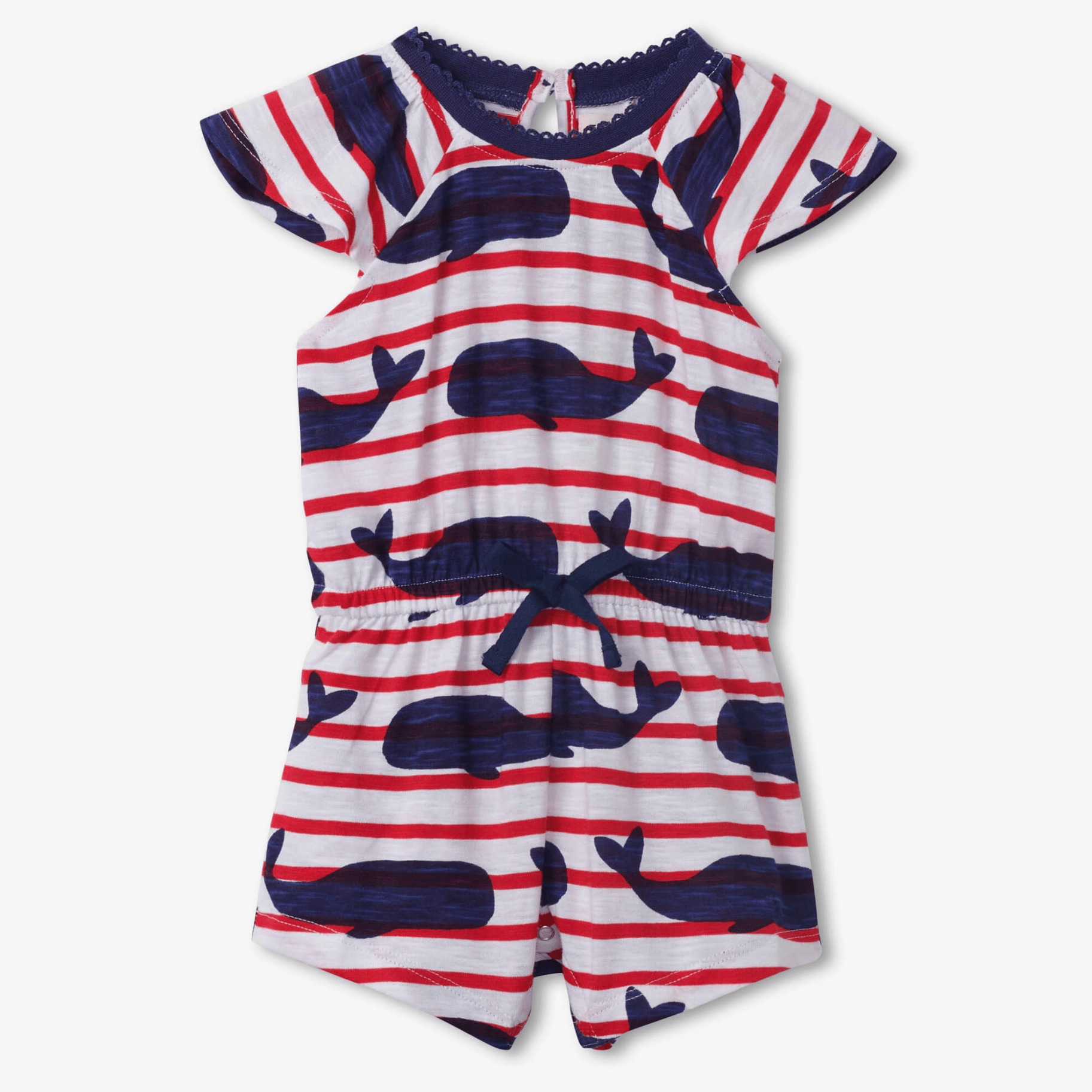 This Hatley 'Nautical Whales' Flutter design navy and red romper has a cool whale design throughout the garment, complete with flutter shoulder sleeves and elastic waistband with navy bow. Together with buttons with poppers below down the top of legs to fasten for easy changing. Made from a soft and lightweight cotton designed to stay cool in summer.