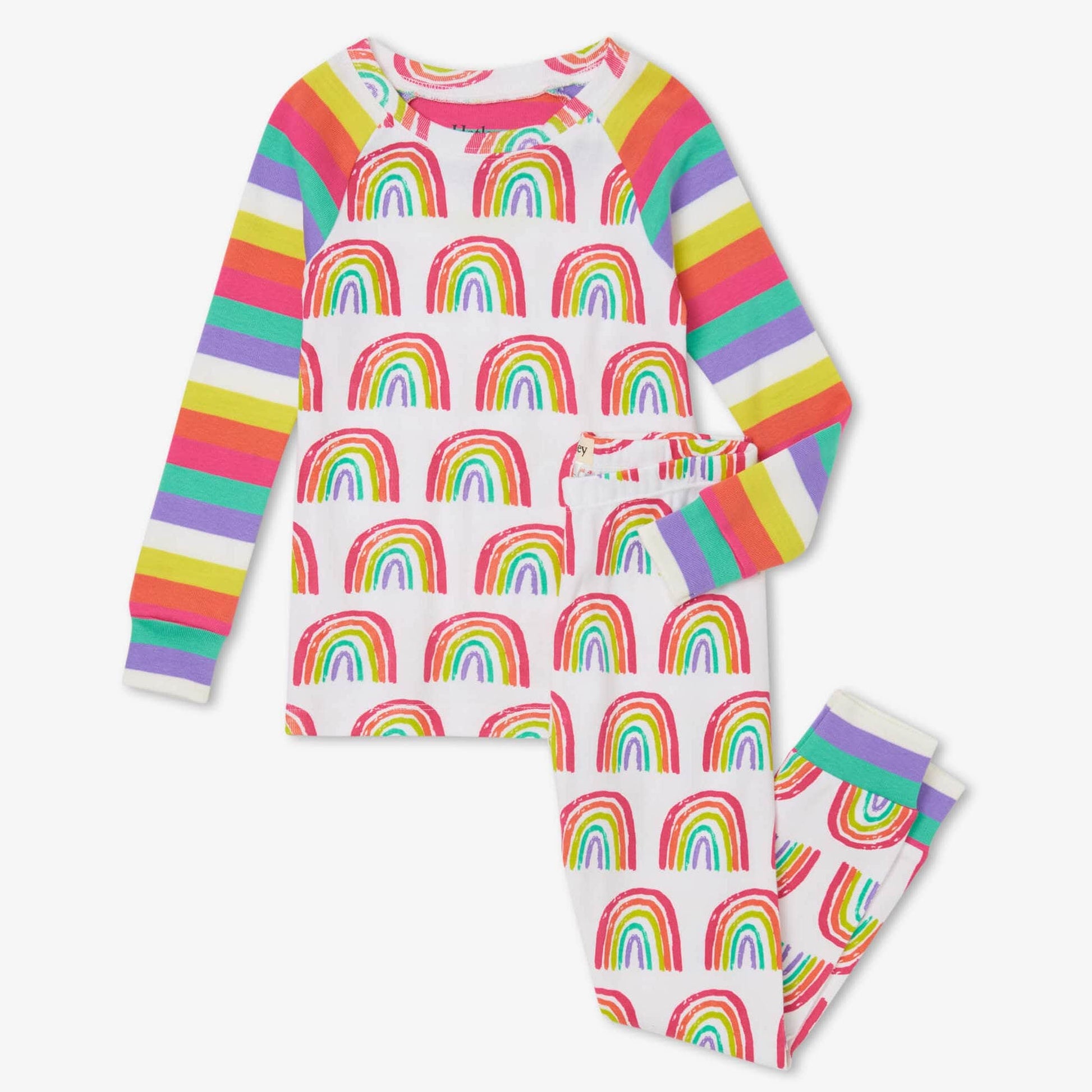 This Hatley 'Cotton Candy Stripes' pink PJ set has a super stylish 4 stripe print throughout the two piece, together with a pink trim on the cuffs. Made from an extremely soft and stretchy organic cotton designed for comfort at bed time. Finished with an elastic waist making changing an easy task.