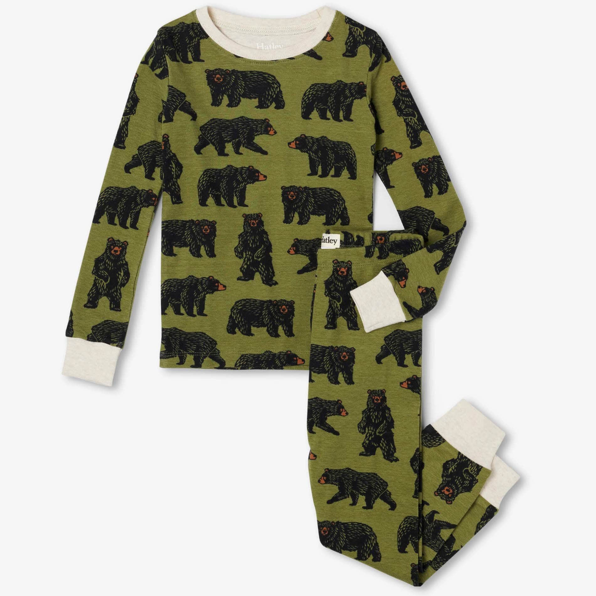 This Hatley 'Wild Bears' PJ Set has a grizzly bear print throughout the two piece, together with a beige trim on the neck, hands and feet. Made from an extremely soft and stretchy organic cotton designed for your baby's comfort at bed time. Finished with an elastic waist making changing an easy task.