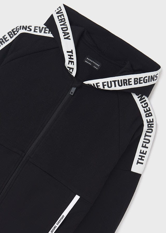 A great wardrobe staple is this black zip front hoodie. Complete with 'The Future Begins Here' black on white print along shoulders and trimming the hood.