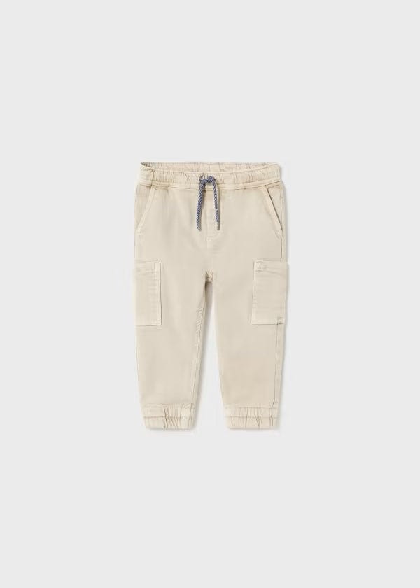 These Mayoral baby boys beige cargo pants are soft and stretchy. Finished with an elastic waist for comfort and easy changing and a draw string tie.