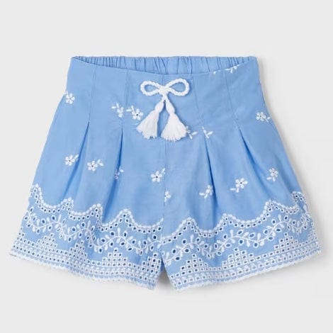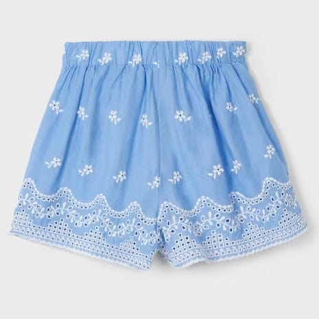 This Mayoral blue embroidered skort has delicate scattered embroidered flowers throughout with border embroidery to the legs. Finished with elasticated waist and decorative bow tie these are both stylish and practical.