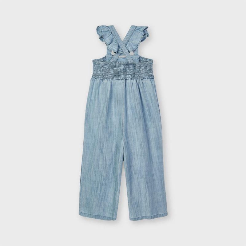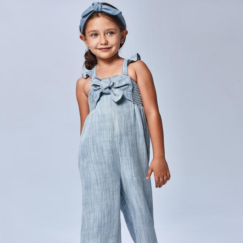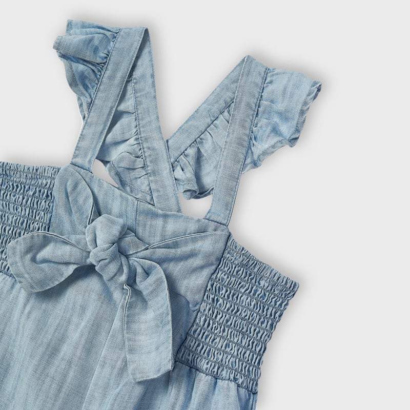 This Mayoral girls denim jumpsuit has a cute bow design on the front of the garment, together with a stunning frilly design on the shoulder straps. The jumpsuit is made from a soft and lightweight material with elastic on the back designed for comfort, making this the perfect jumpsuit for your little girl.