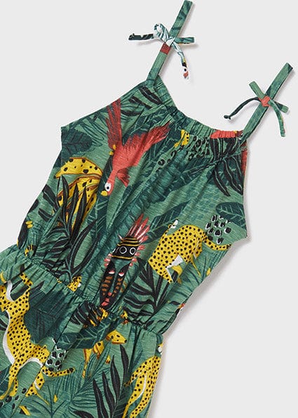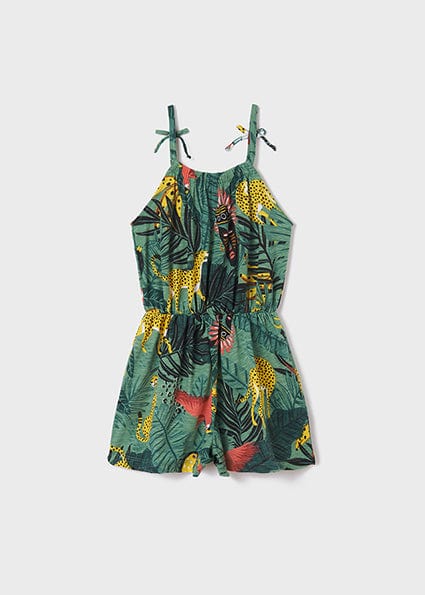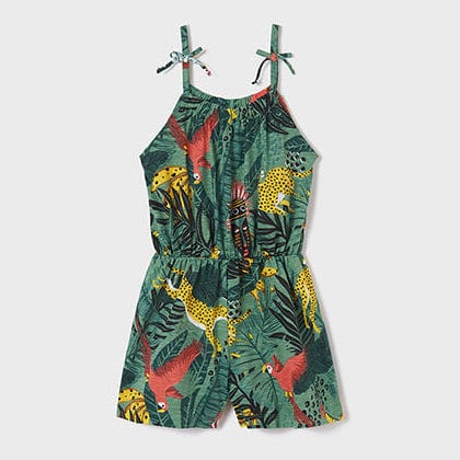 This safari print playsuit has a luscious green background with Cheetahs, Parrots and Toucans scattered over the print.