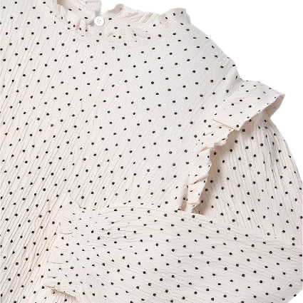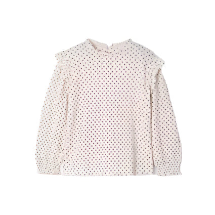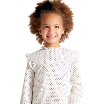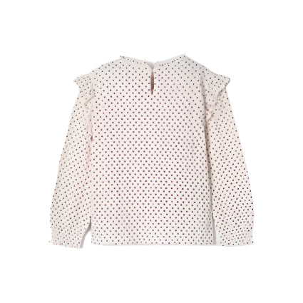 This Mayoral Girls Long Sleeve Polka Dot T-Shirt comes with a ruffled round neckline and ruffles on the shoulders . There is a small opening on the back with a button fastening to allow the garment to be put on/taken off easily.