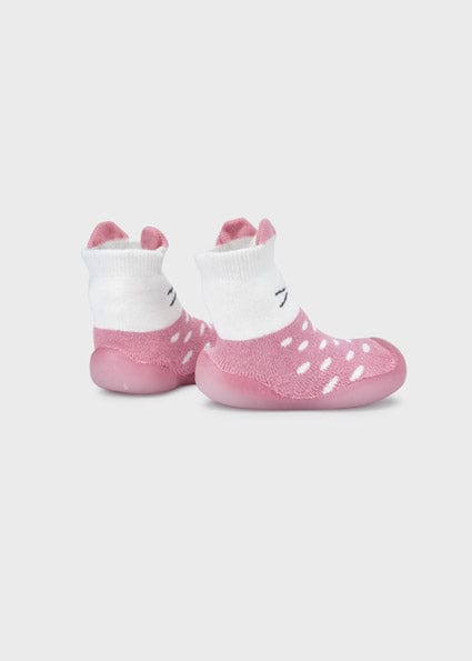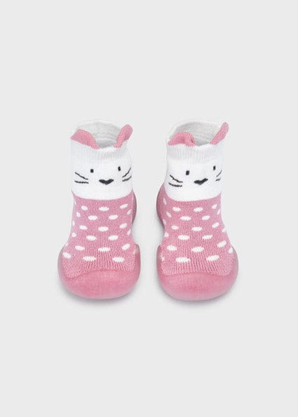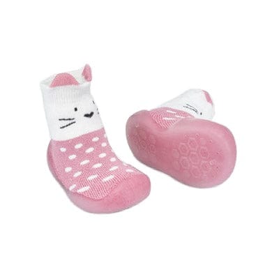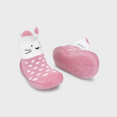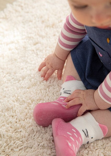 These comfy shoe sock are perfect for little ones on the move the squishy rubber on the sole to provide grip and support for babies feet. The top of the sock is finished with an adorable cat face design with a pink and white polka dot pattern following throughout down to the sole.