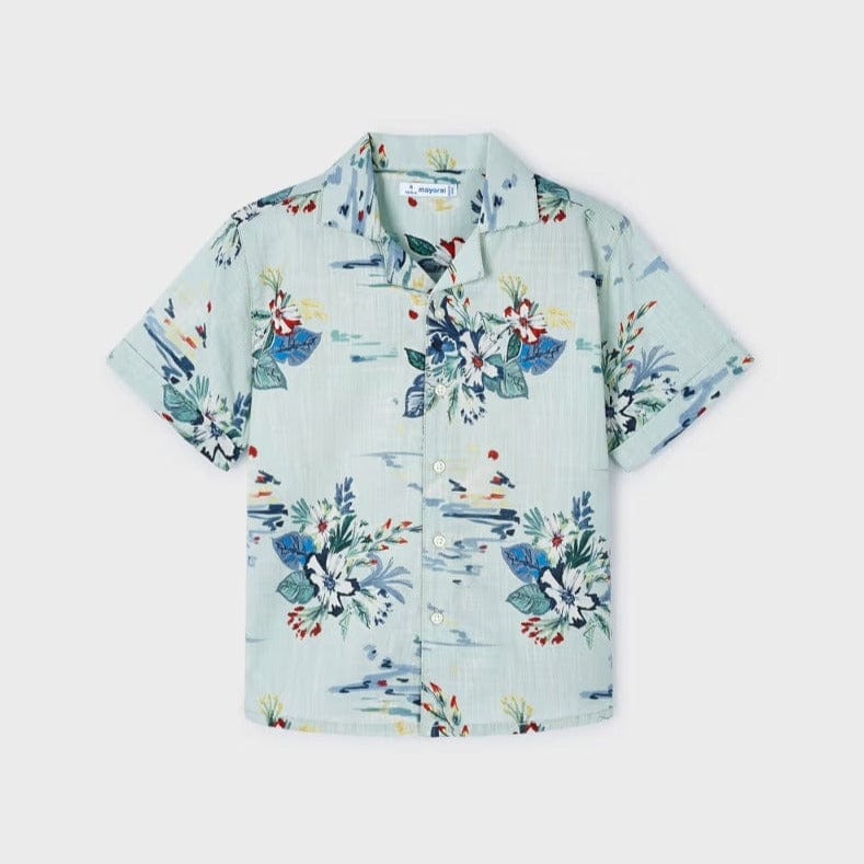 From Mayoral this mint shirt has a tropical hawaiian print throughout and will work well with both shorts and jeans.