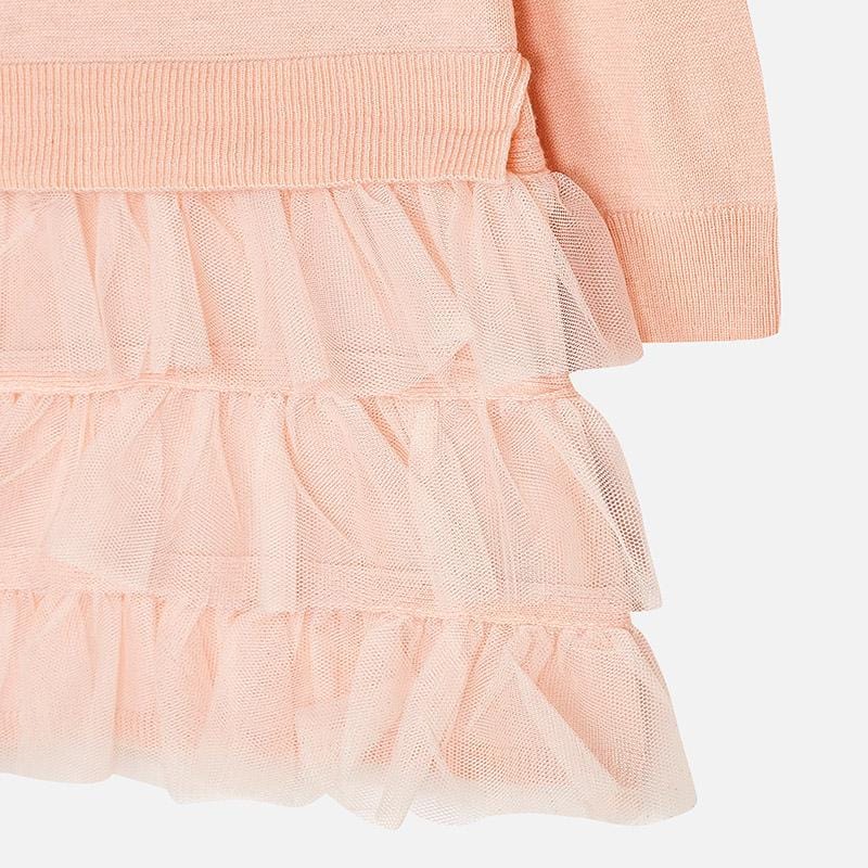 This Mayoral nude knit dress is made from a super soft and stretchy material designed for comfort, complete with stunning tiered tulle ruffle trim from the waist down, together with a stylish feather design.