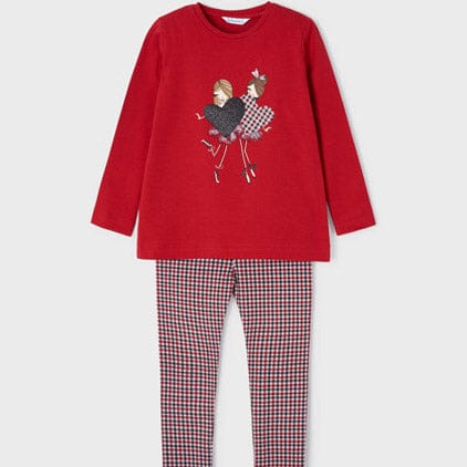 This Mayoral girls two piece set has a long sleeved Red top with a cute friends holding two patterned hearts on the front of the garment, together with red, navy and white bottoms with a beautiful checked print throughout. The two piece is made from a super soft and stretchy material designed for comfort. Finished with an elastic waist for easy changing.