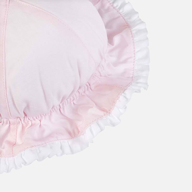 This Mayoral girls reversible sun hat is plain pink with a stunning white frilly trim and on the reverse plain white. Finished with elastic for the perfect fit and to prevent the hat falling off, making this the perfect summer hat for your little girl.