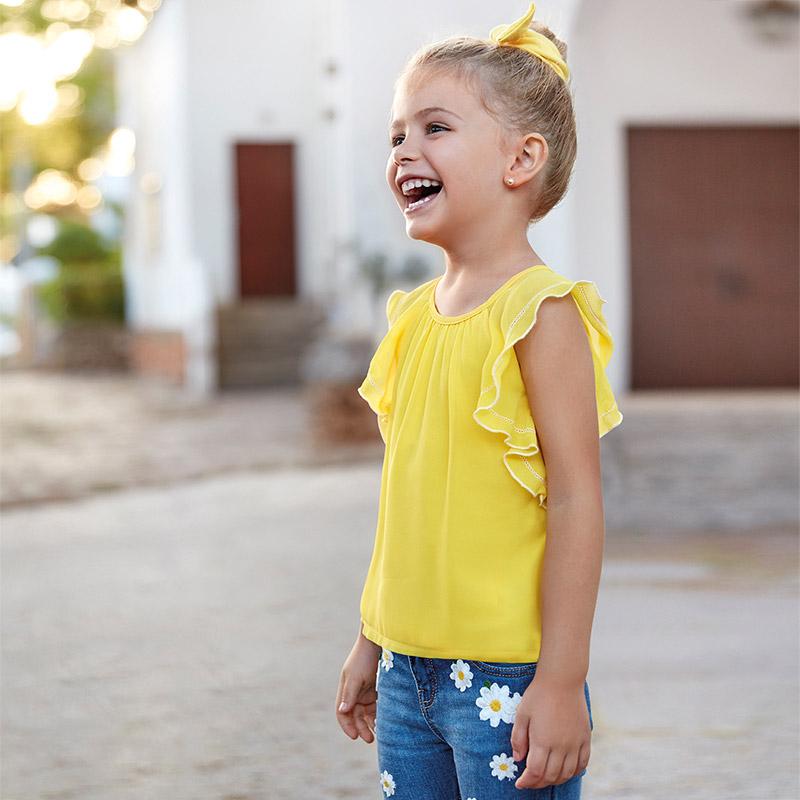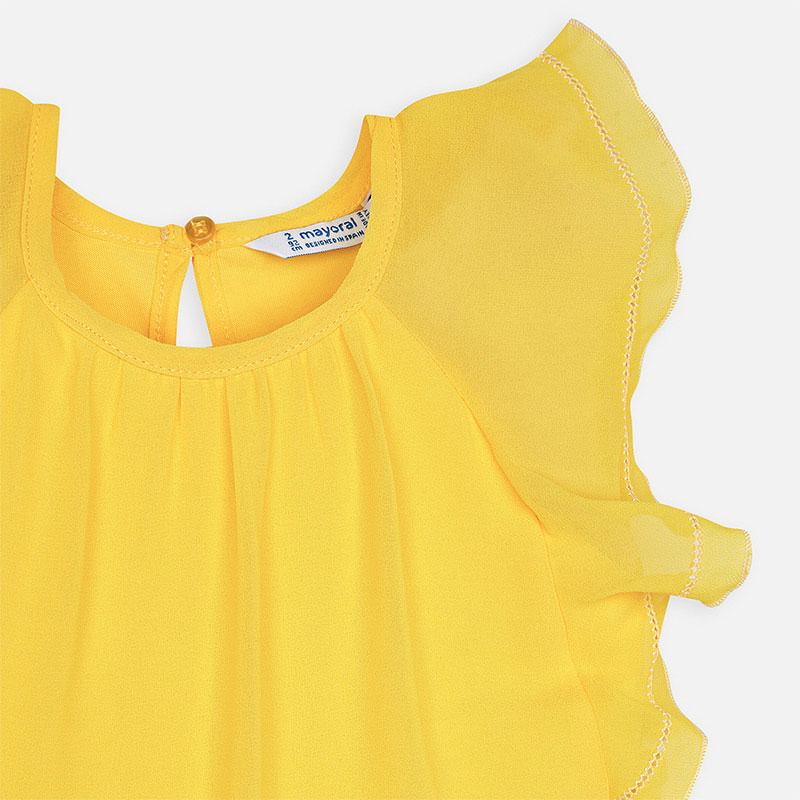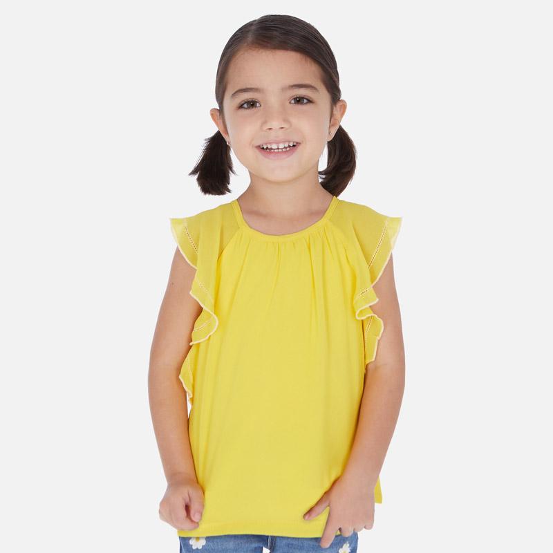 This Mayoral yellow top has a stylish ruffle design on the sleeves and is made from a super soft and lightweight material designed for comfort. Finished with a button at the back to fasten for easy changing, making this the perfect summer top for your little one.