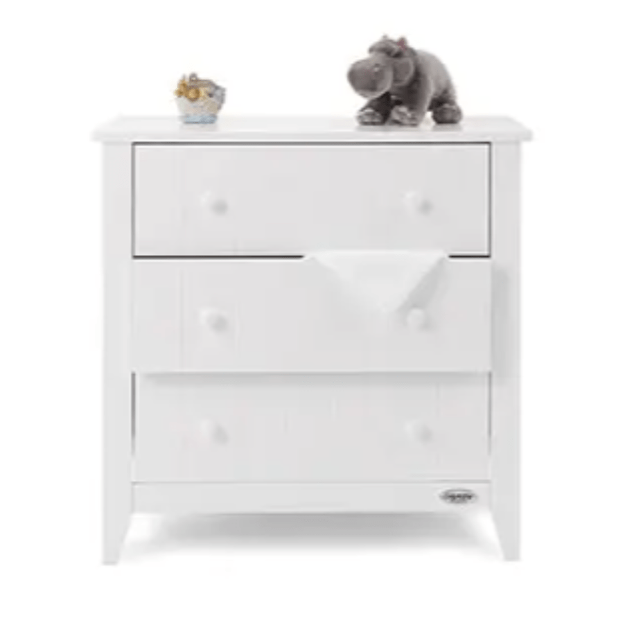 Three deep, 38L capacity drawers offer a convenient storage solution for little one’s things and the smooth runners make sure using the drawers is a hassle-free experience. All drawers feature a stylish slatted design that coordinates perfectly with the rest of the Belton furniture range. If used with the optional Belton multi top changer, the chest of drawers becomes the base for a perfect height changing unit and can be securely attached together if it is to be used permanently in this way.