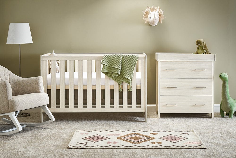 The Obaby Nika range offers a contemporary design, due to its clean lines and textured oak effect finish, that will fit perfectly in today’s modern nursery. This 2 piece room set consists of Nika cot bed and changing unit.