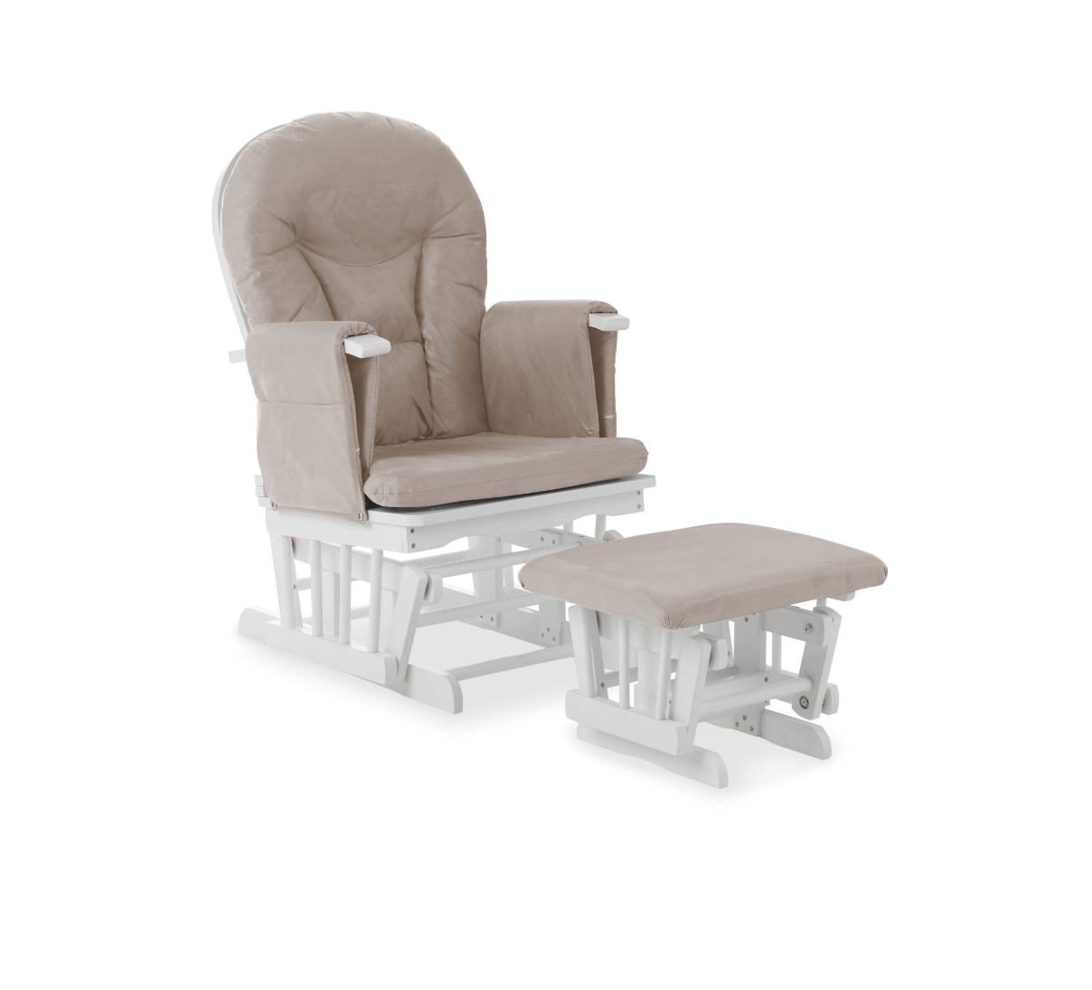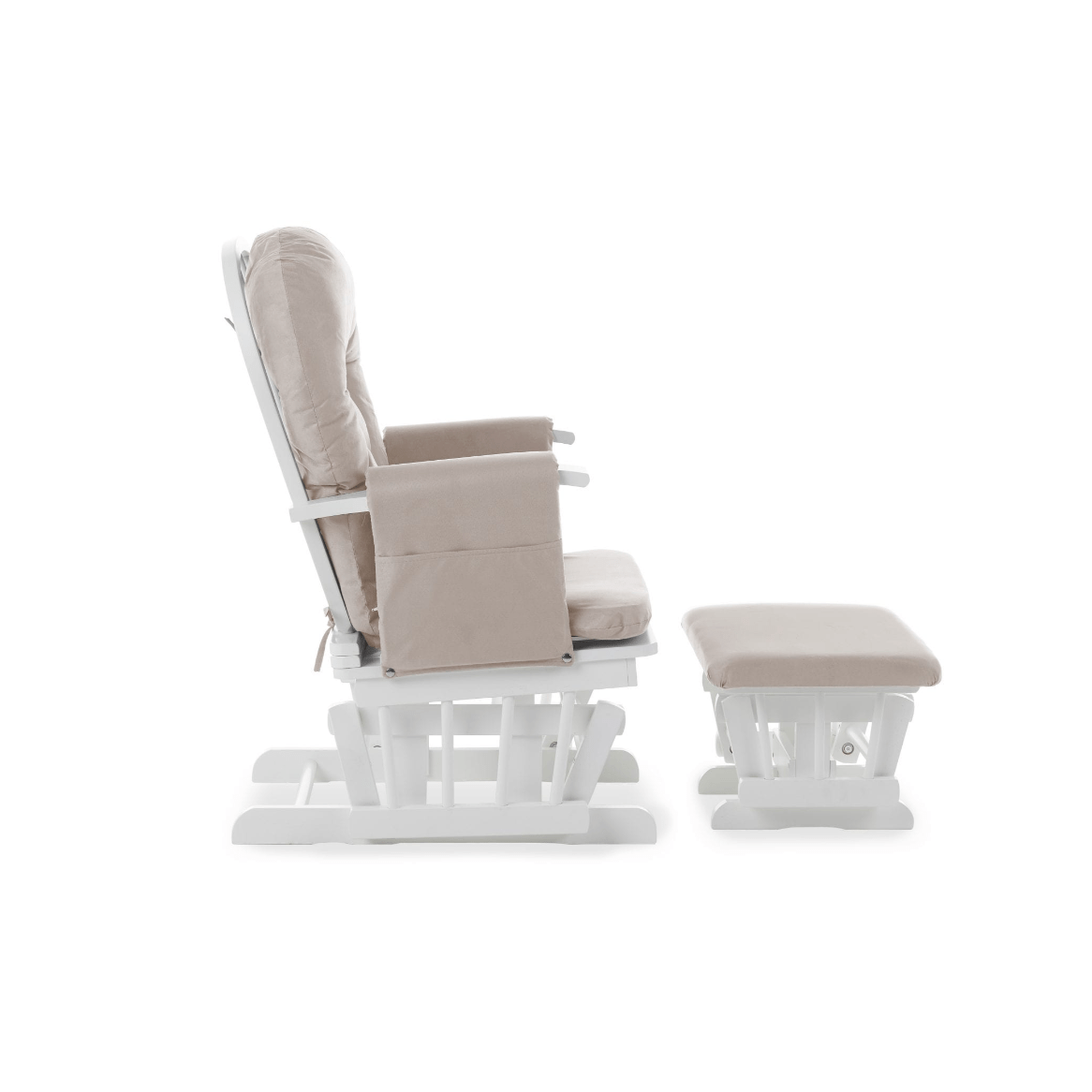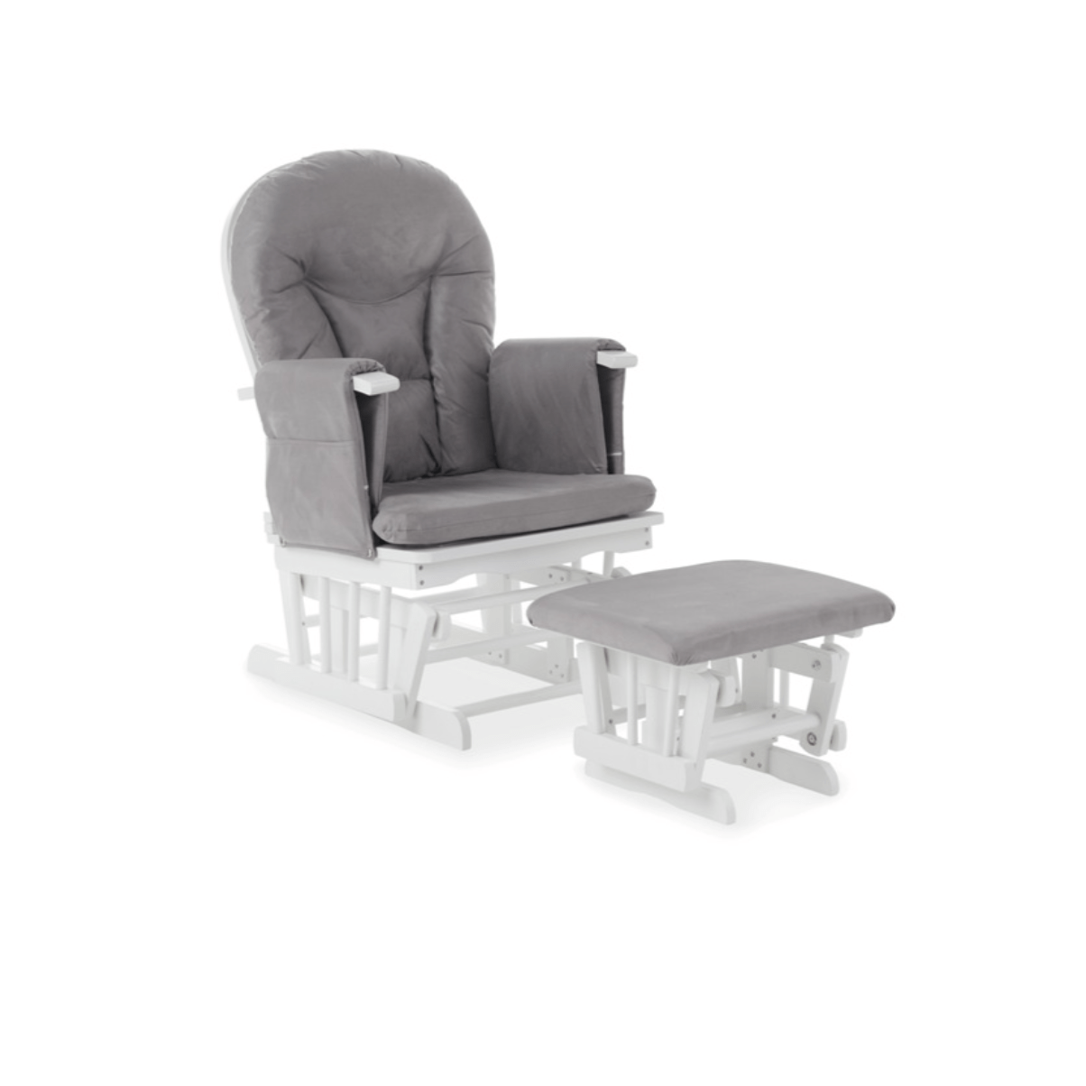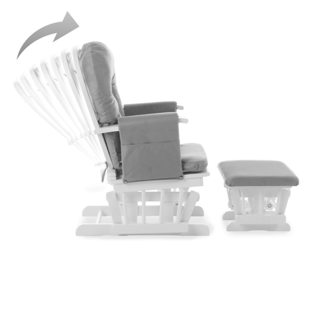 By simply lifting the arm ends, the backrest angle can be effortlessly adjusted by an impressive seven positions so you can always find the right one for you. The comfy back and seat cushions ensure you never want to leave and the padded arm rests each feature a handy storage pocket to keep any important items close to hand. The carefully constructed wooden frame and curved back show off the traditional design while the soft grey tones of the cushions make certain that the chair and stool will coordinate perfectly in any nursery.