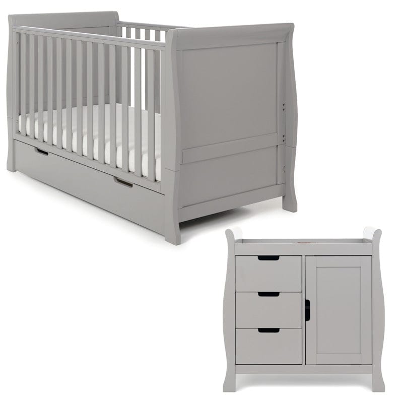 The Obaby Stamford furniture range offers families the perfect combination of style, quality and practicality. The Stamford Classic 2 piece room set consists of the beautiful Stamford Classic cot bed with under drawer and closed changing unit. Both pieces feature the same elegant sleigh design that flows throughout the Stamford range.
