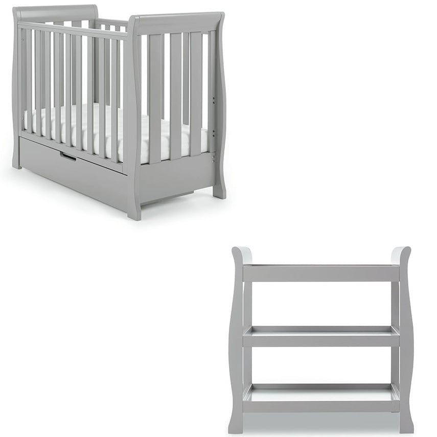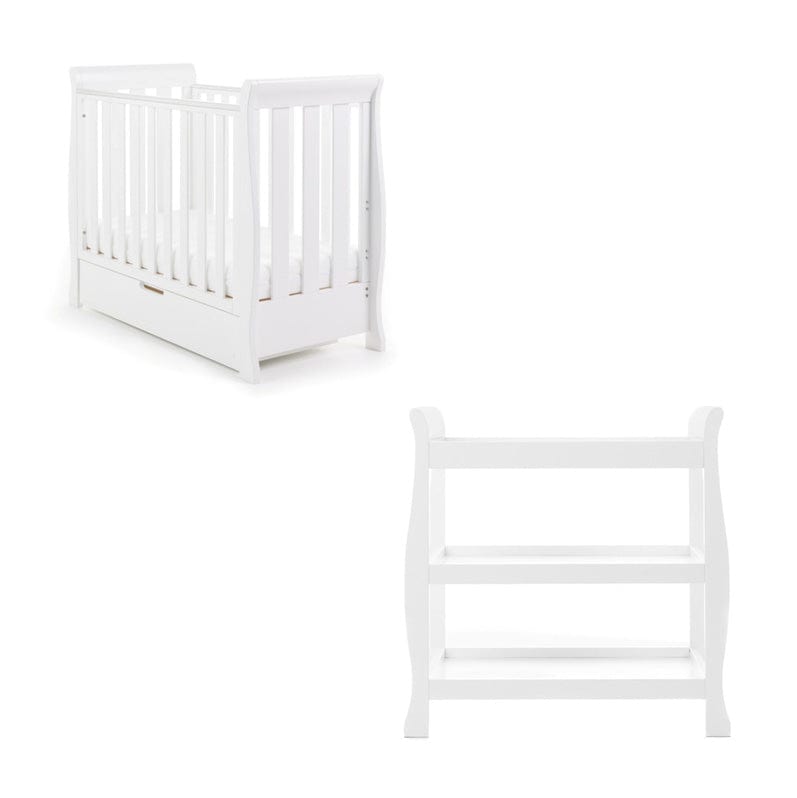 The Obaby Stamford furniture range offers families the perfect combination of style, quality and practicality. The Stamford Space Saver 2 piece room set consists of the beautiful and compact Stamford Space Saver cot with under drawer and the practical open changing unit. Both pieces feature the same elegant sleigh design that flows through the rest of the Stamford range.