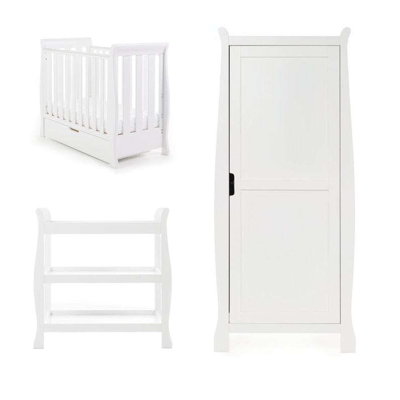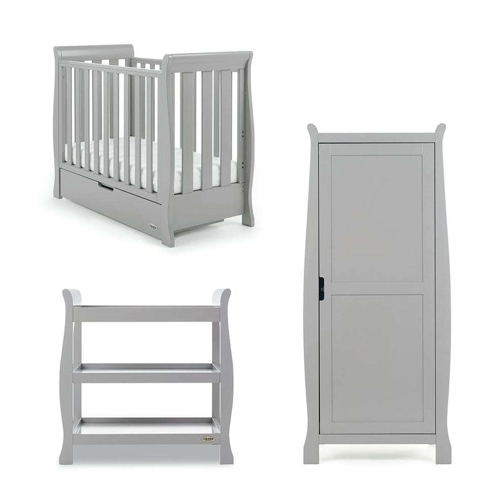 The Obaby Stamford furniture range offers families the perfect combination of style, quality and practicality. The Stamford Space Saver 3 piece room set consists of the beautiful and compact Stamford Space Saver cot with under drawer, open changing unit and single wardrobe. All pieces feature the same elegant sleigh design that flows through the rest of the Stamford range.
