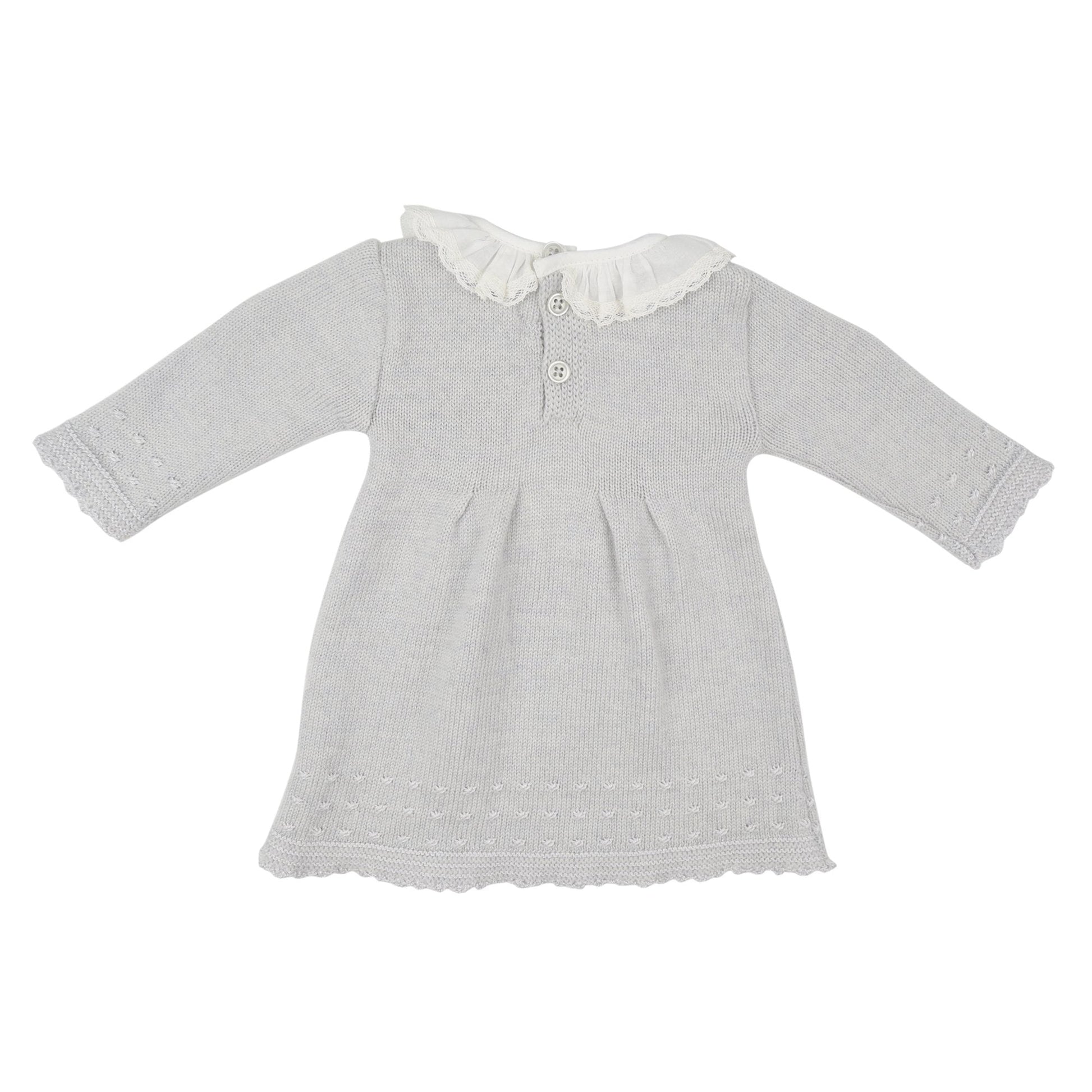 This Paz Rodriguez grey knitted dress has a stylish rounded collar, together with a stunning lace trim and matching trim on the chest. Complete with a cute bow on the chest with a Paz Rodriguez branded button in the centre. Made from a super soft and stretchy cotton designed for comfort. Finished with buttons down the back to fasten for easy changing.