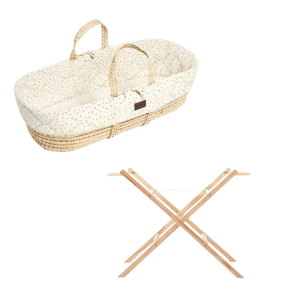 - Includes : Natural Quilted Moses Basket, Little Green Sheep Mattress, Moses Basket Stand