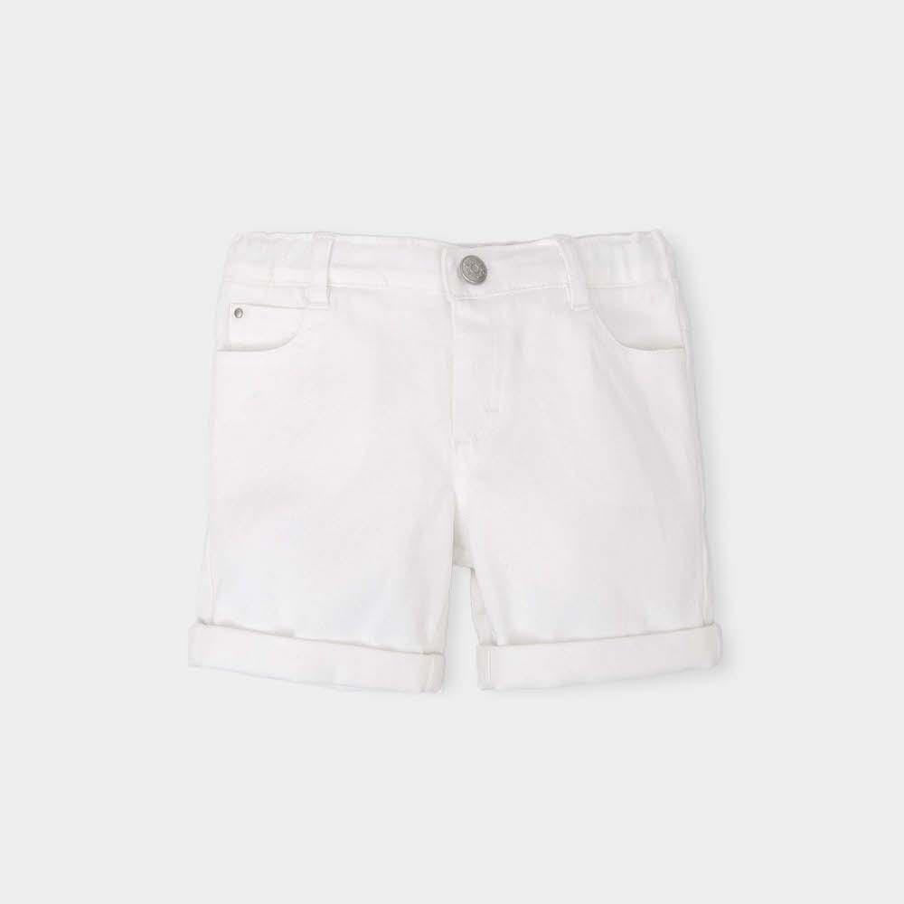 These Tutto Piccolo boys white shorts have two easy access pockets on the front and back, complete with a stylish rolled up design on the legs. Together with a Tutto Piccolo logo on the back and an adjustable waist for comfort. Made from a super soft and stretchy material designed for comfort and ease of movement. Finished with a Tutto Piccolo branded button on the front to fasten for easy changing.
