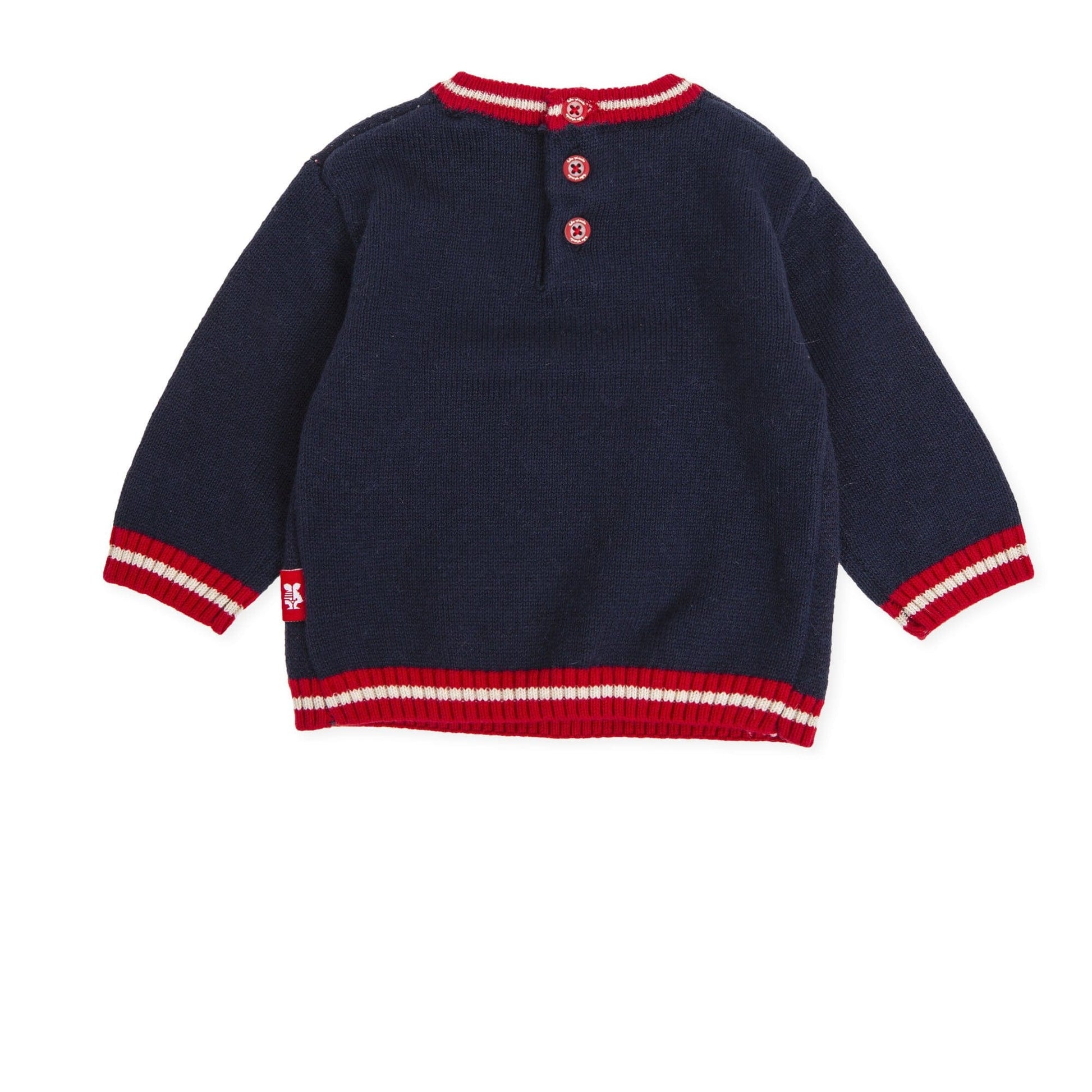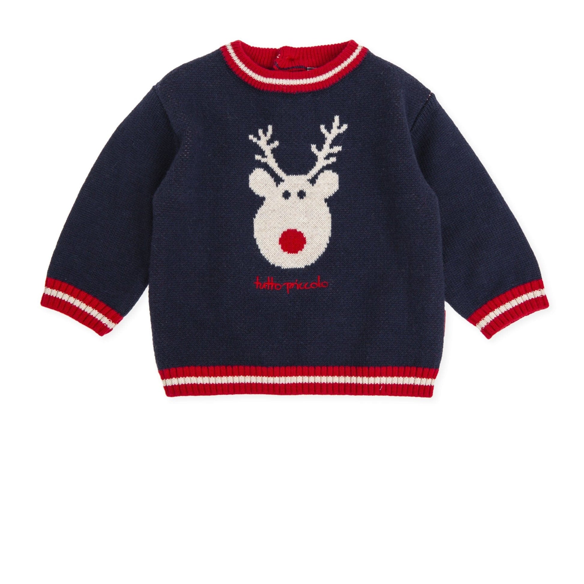 This Tutto Piccolo navy and red two piece set has a navy jumper with a stylish red trim with a cream stripe on the cuffs, hem and around the neck. Together with a super cute reindeer on the chest with an appliqué red nose. Made from an extremely soft and stretchy material designed for your baby boy's comfort. Finished with buttons down the back to fasten and matching red footed bottoms.